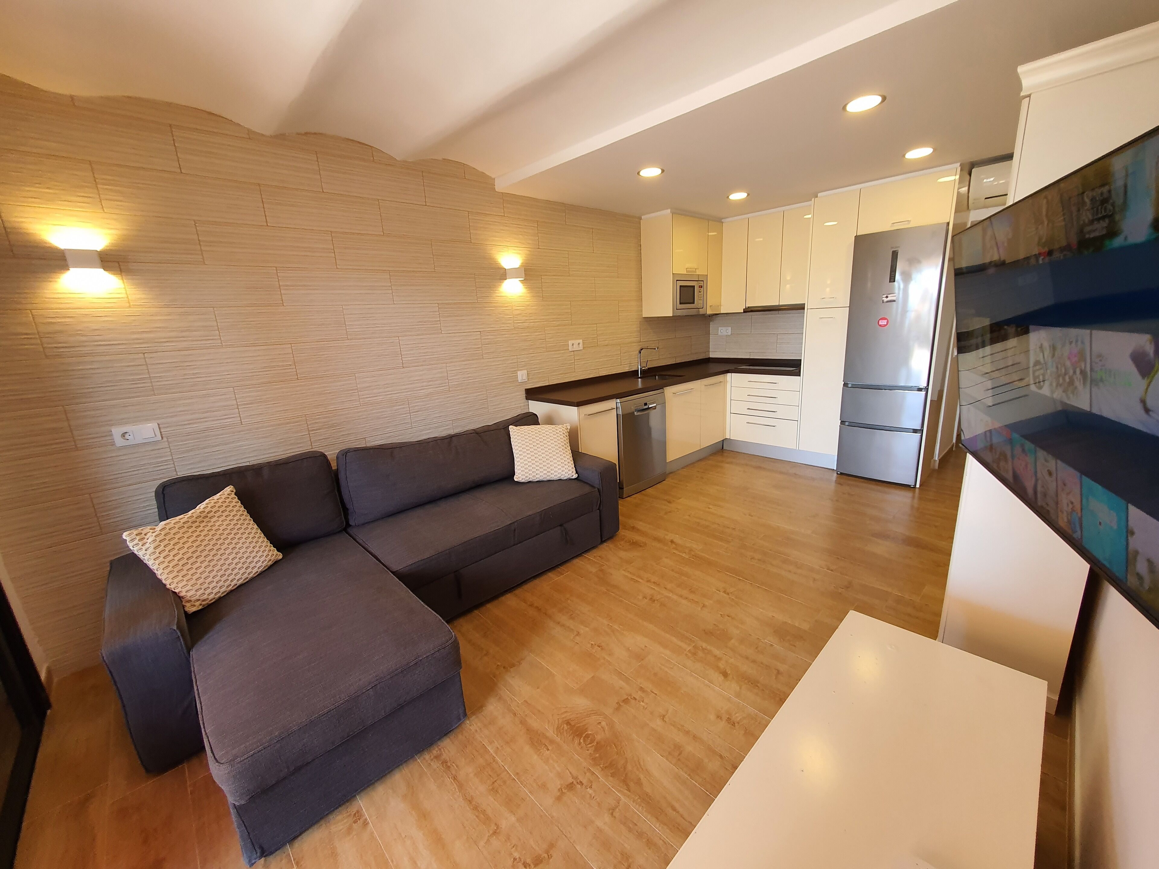 In the living room you have air conditioning, a sofa bed for two people, a 50" SmartTV and WIFI and high-speed internet (1Gbps).