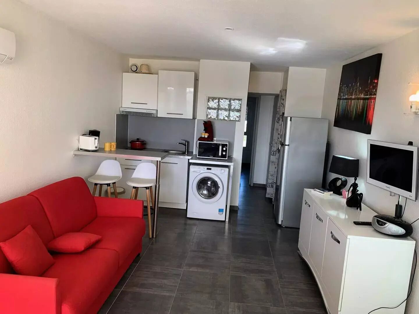 Details: Accessible by train : Marseillan-Plage (2.5 km) Near airport : Marseille Provence Airport #MRS (189.2 km) Naturist Surface (m²) : 28 View : on gardens Floor : 1 Exposure : North Washing machine Microwave oven Air conditioner Terrace Pets Allowed Number of pieces : 2 Number of bathroom : 1 Number of bedrooms : 1 Number of single beds Number of double bed : 1 Fridge Television Elevator Cooking plate Car park Cooked : 1 Heating : 1 kettle Coffee maker Number of stars : 1 Dishes and cutlery : 1